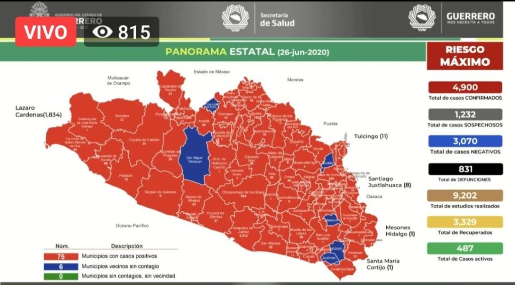 Chilpancingo, Gro. 26 de Junio del 2020.- Guerrero registró este viernes 79 nuevos casos de Covid-19 y suman 4 mil 900 casos acumulados, así como 831 defunciones, de acuerdo con la información de la Secretaría de Salud del Estado.