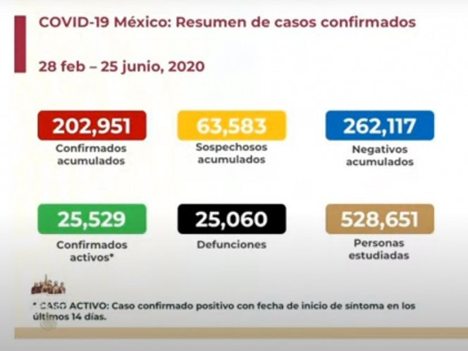 México llegó este jueves a 25 mil 60 personas fallecidas y 202 mil 951 contagios de COVID 19, al registrar 734 nuevos decesos y otros 6 mil 104 nuevos contagios, en el día 25 de lo que el gobierno federal ha llamado “nueva normalidad”.