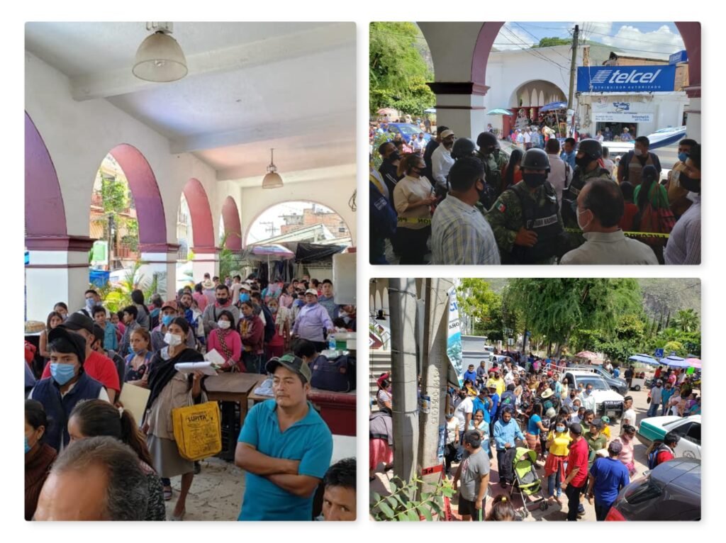 En el corredor del palacio municipal se ha instalado un módulo de Telecom para que las personas puedan acudir a realizar trámites de apoyos de programas sociales del gobierno federal, por lo que a unas horas de la quincena llegaron cientos de personas, a las que el alcalde explicó que “se les retiró del corredor, pero antes ya se les había hecho la invitación de que guardaran distancia, que deben usar el cubrebocas”.