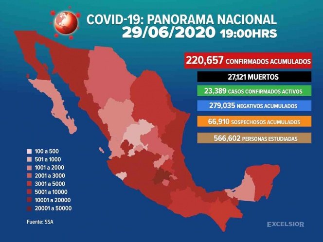 El número de personas fallecidas por COVID-19 en México aumentó este lunes a 27 mil 121, mientras que los casos confirmados llegaron a 220 mil 657 en el día 29 de la “nueva normalidad”, lo que representa 473 muertes y 3 mil 805 casos positivos más que el domingo.