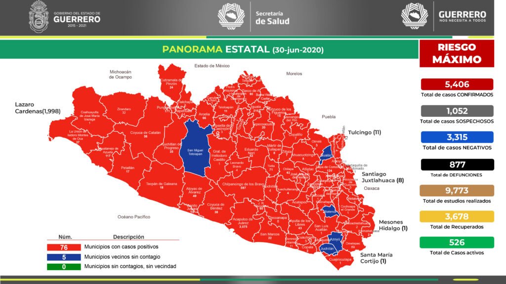 En el panorama estatal informó que solamente quedan 5 municipios vecinos sin contagio; uno en Tierra Caliente, dos en la Montaña y dos en la Costa Chica.