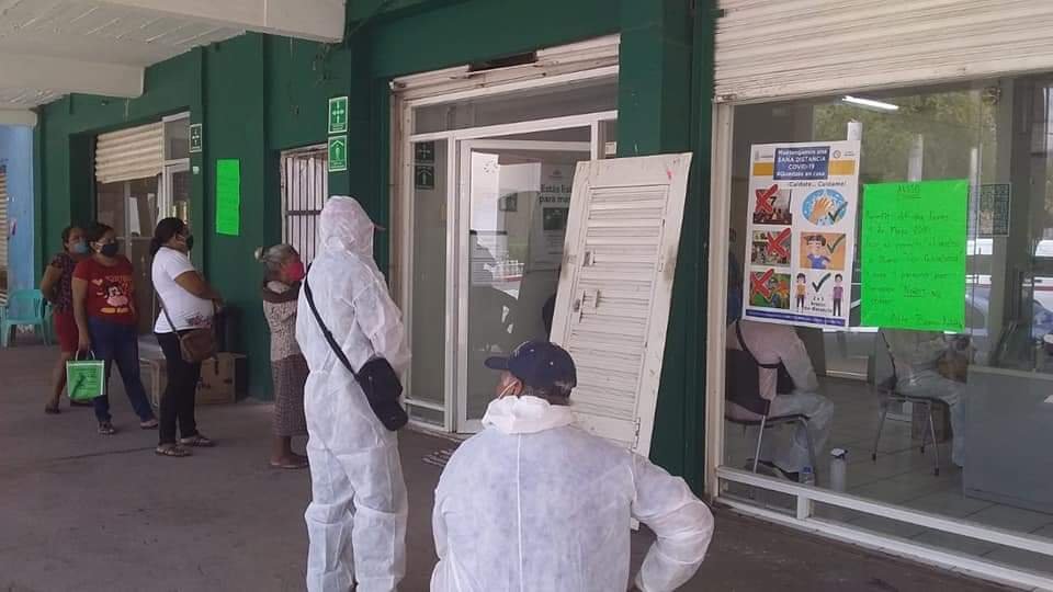 Vestidos con trajes de protección, guantes, googles y cubrebocas N-95, profesores y ciudadanos de San Miguel Totolapan fueron a cobrar sus cheques y pagos de programas sociales esta quincena a sucursales bancarias en otros municipios.