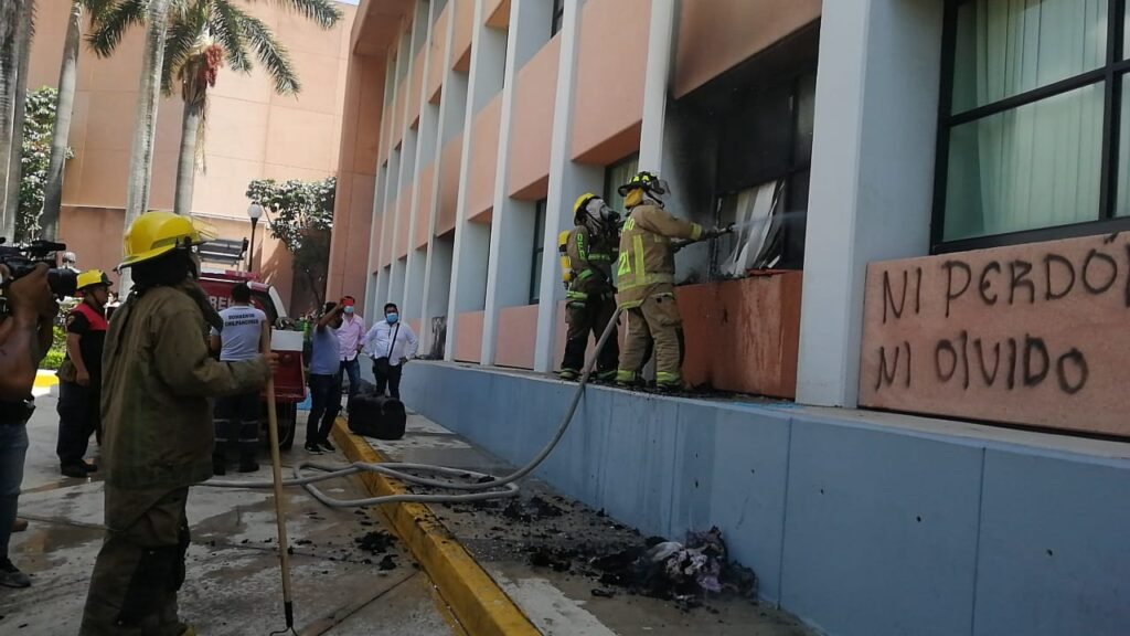 Luego de la protesta violenta por parte de los normalistas, elementos de los Bomberos llegaron y comenzaron a hacer sus acciones, apagando el fuego, que dejó diversos destrozos en el inmueble.