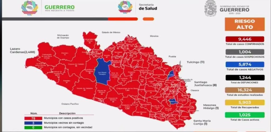 Destacó que del total de contagios, hay mil 25 enfermos activos y que el 87 por ciento de ellos se concentran en los municipios de Acapulco, Chilpancingo y Zihuatanejo.