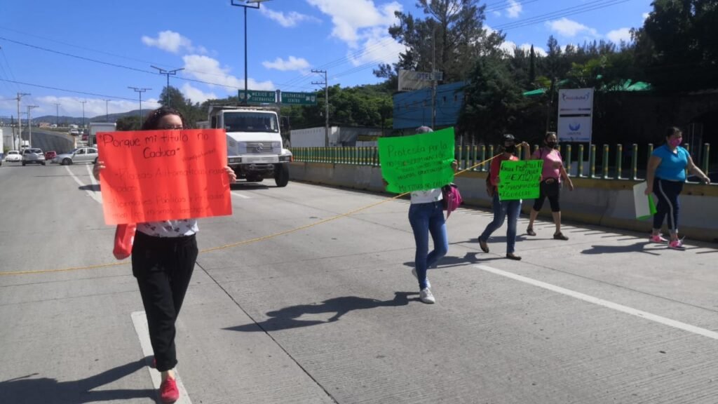 Una veintena de afiliados al Frente de Normalistas de Generaciones Anteriores del Estado de Guerrero bloquearon unos minutos la Autopista del Sol para exigir al gobierno del estado y autoridades educativas la oportunidad de participar en la asignación de plazas docentes.