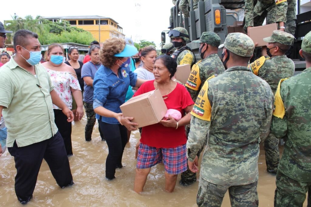 Acompañada por elementos de la Secretaría de la Defensa Nacional y autoridades municipales, Mercedes Calvo realizó la entrega de apoyo alimentario, agua embotellada, colchonetas, cobertores y ropa.