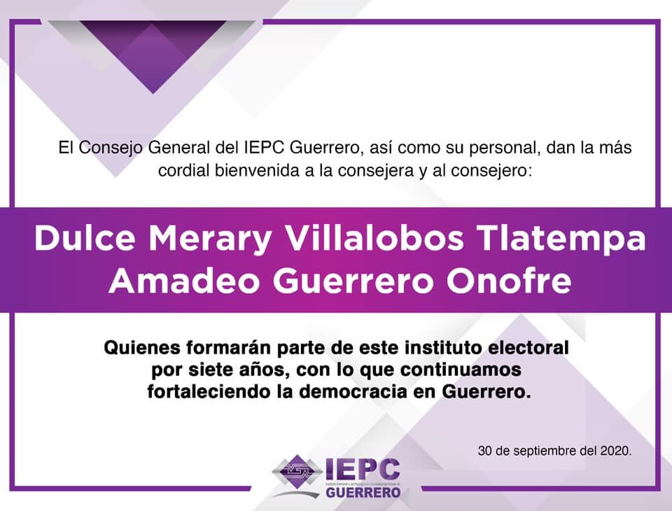 Dulce Merary Villalobos Tlatempa y Amadeo Guerrero Onofre van a sustituir a los consejeros Rosio Calleja Niño y Jorge Valdez Méndez, quienes concluyeron su período para el que fueron electos y se van a sumar al Consejo General del IEPC que integran Nazarín Vargas Armenta, Cinthya Citlali Díaz Fuentes, Vicente Molina Revuelta, Edmar León García y Azucena Cayetano.