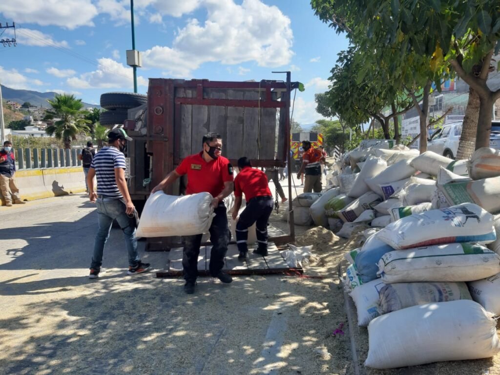 La unidad tipo torton iba cargada con pasto para ganado bovino y a exceso de velocidad, el conductor perdió el control y se subió al camellón, luego se volcó por lo que los costales de forrajes salieron volando y se esparcieron sobre la carpeta asfáltica.
