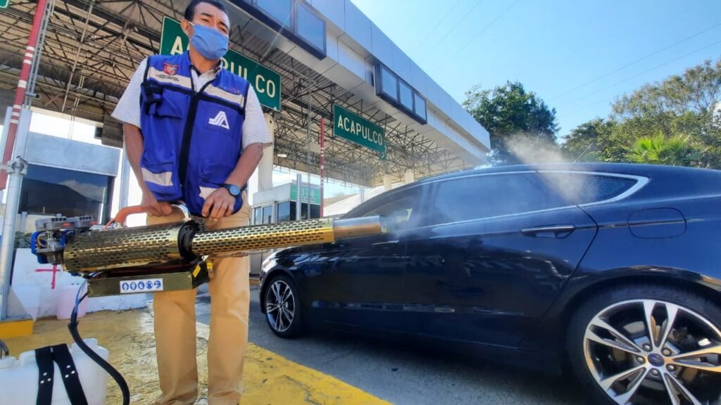 Este martes, la Secretaría de Salud de Chilpancingo, en coordinación con Carreteras y Puentes Federales (Capufe), instaló un filtro sanitizante en la caseta de cobro de la Autopista del Sol ubicada en Palo Blanco.