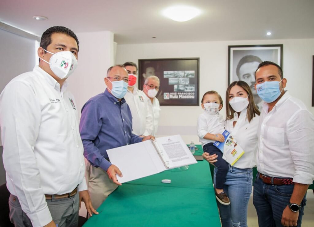 En medio de un protocolo preventivo por la pandemia de COVID-19, el joven político ingresó a las oficinas del tricolor acompañado por su esposa y su pequeño hijo para registrar oficialmente su aspiración.