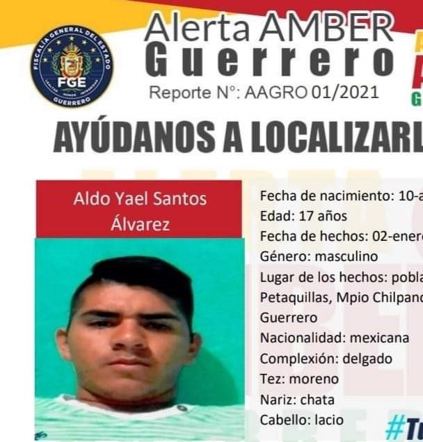 Este lunes la Fiscalía General del Estado (FGE) dio a conocer la desaparición de Aldo Yael Santos Álvarez, en el poblado de Petaquillas, municipio de Chilpancingo de los Bravo.