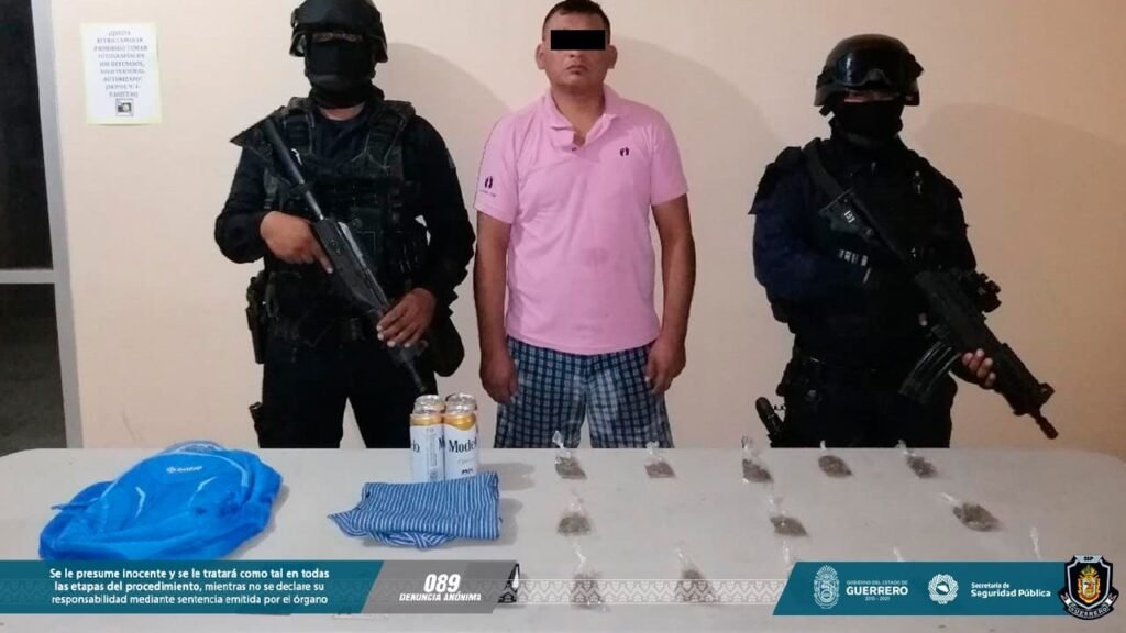 ACAPULCO. — Agentes de la Policía Estatal aseguraron a un individuo en posesión de presunta droga, durante un recorrido de seguridad en la colonia Las Cruces.