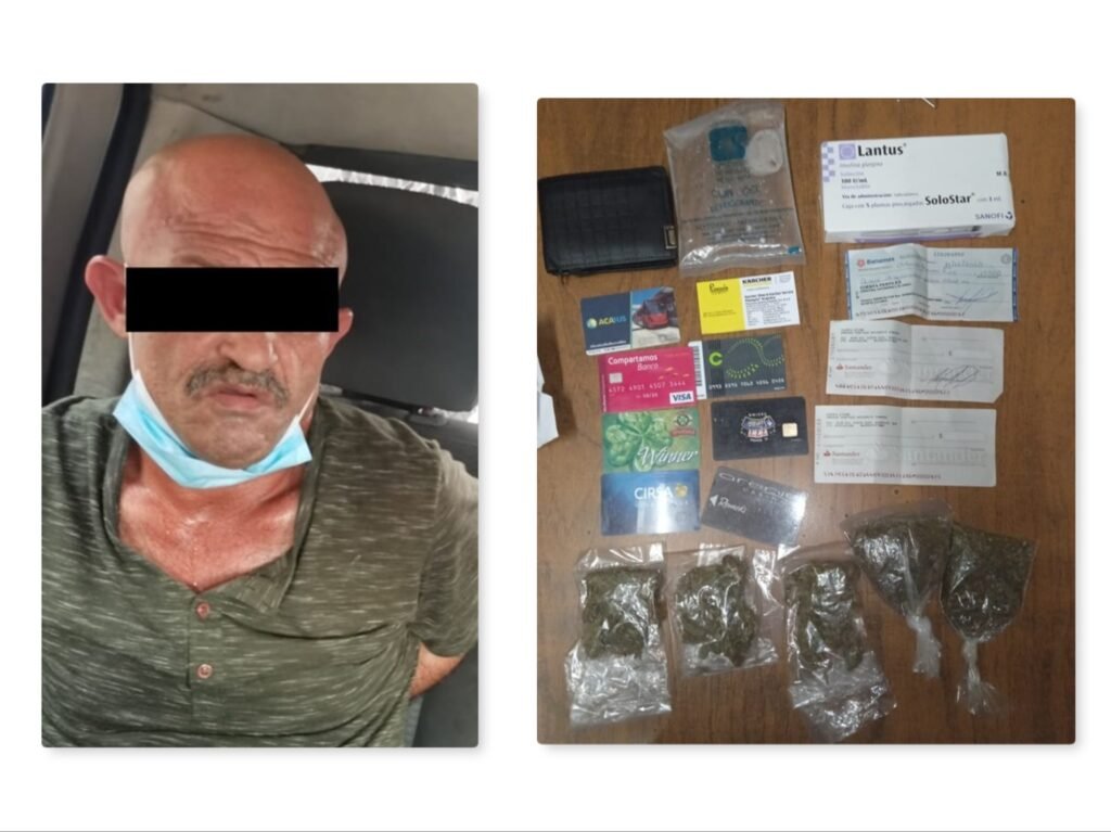 Los elementos procedieron a calmar los ánimos para poner orden e invitaron a quien dijo llamarse Jorge “N” a salir de la farmacia; una vez afuera, al solicitarle una inspección de sus pertenencia, le encontraron en la bolsa de su bermuda cinco bolsas de plástico con hierba verde similar a la marihuana, así también varios cheques de diferentes instituciones bancarias a otro nombre y tarjetas de establecimientos varios.