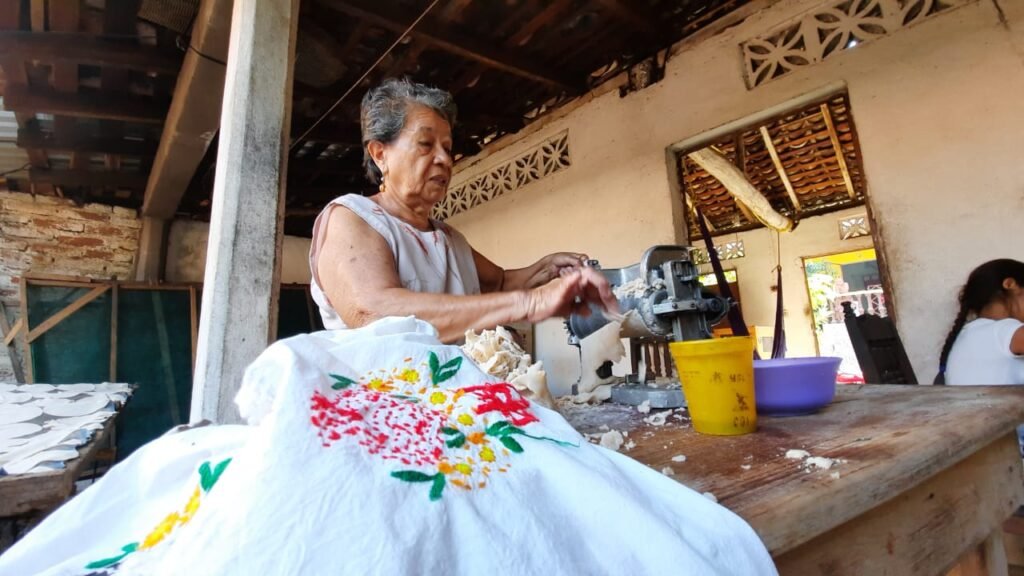 Desde temprana hora, doña Carmen dijo que en compañía de su hija, elaboran la masa vertidas con diversas especies, después de que están listas para el amasado y con maquinaria rudimentaria que ha comprado a lo largo de los años, elabora las tortillas que después coloca en un horno de leña y posteriormente las pone en una malla que ella misma construyó para dejar secar su producto.