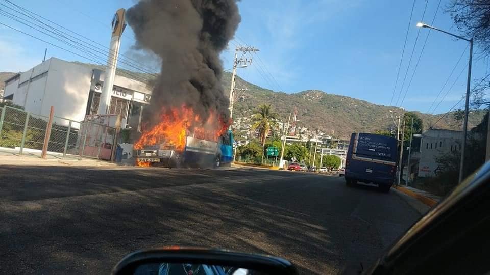 Hombres armados le prendieron fuego a un camión urbano del servicio público en la avenida Farallón, en el puerto de Acapulco.