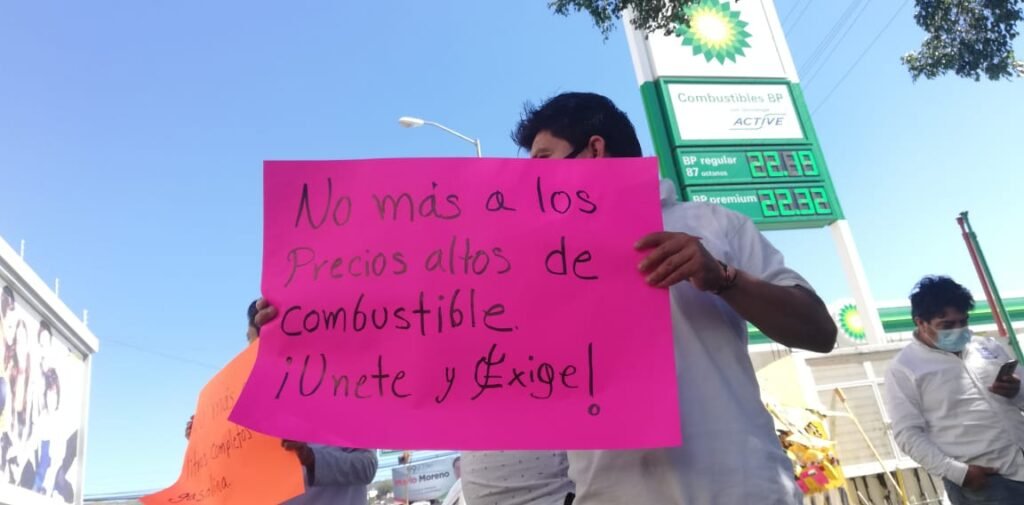 Con pancartas demandaban además que las estaciones de servicio despachen litros completos de combustible porque los empresarios, sin supervisión de la Profeco, “han abusado” de los consumidores, por lo que exigieron a las autoridades federales “que los metan en cintura”.