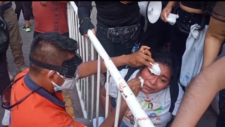 De forma repentina, una mujer se acercó y con un megáfono golpeó en el rostro a una de las feministas identificada como Yolitzin Jaimes, que enseguida empezó a sangrar.