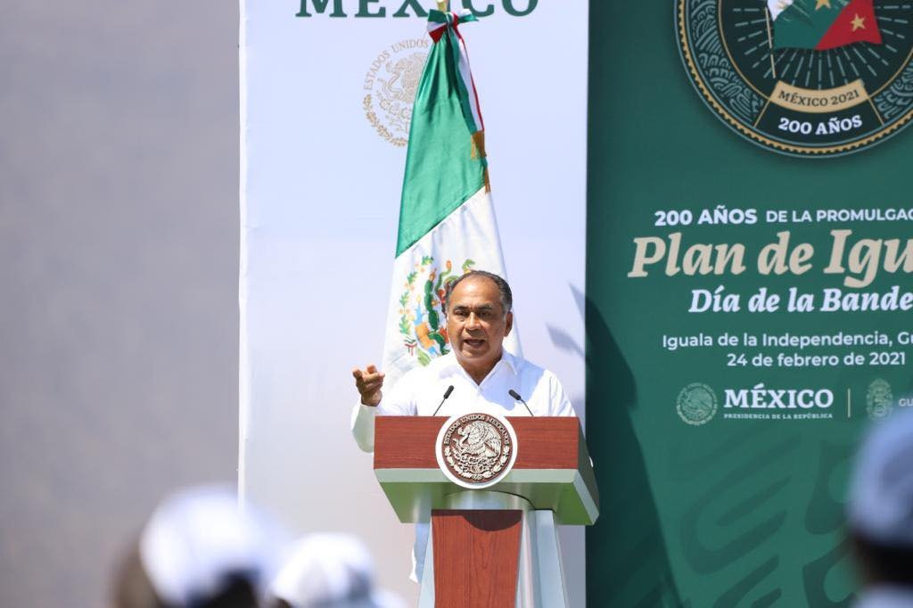 Indicó que la bandera, junto con el Escudo y el Himno Nacional, constituyen los símbolos máximos que comprometen a las mexicanas y mexicanos. La Bandera Nacional, dijo, es majestuosa e infinita, porque nos envuelve a todos, y que Iguala es orgullo para los mexicanos, porque aquí, el 24 de febrero de 1821, se proclamó el Plan de Iguala, en el que destacan dos personajes: Vicente Guerrero, el auténtico consumador de la independencia, y Agustín de Iturbide.