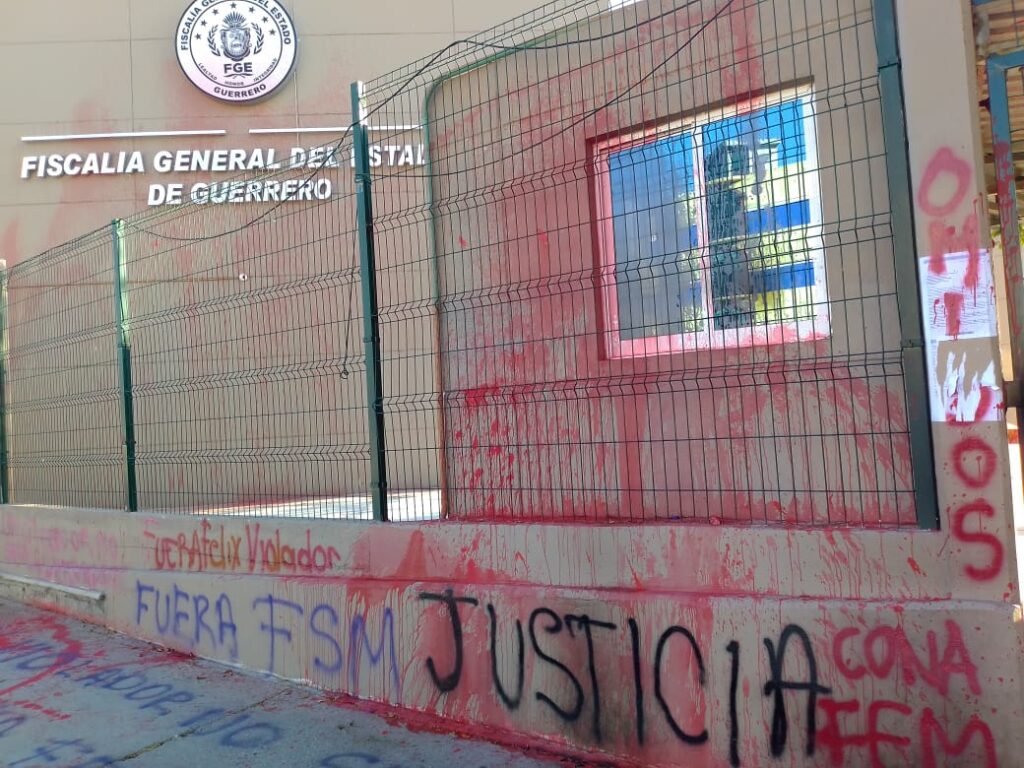 Integrantes de la Colectiva Nacional Feminista (Conafem) protestaron afuera de las instalaciones de la Fiscalía General del Estado (FGE), donde lanzaron pintura al interior y realizaron pintas en la barda para exigir que se proceda en contra del senador con licencia Félix Salgado Macedonio, quien fue acusado por el delito de violación en 2016, pero hasta el momento no se ha judicializado la carpeta de investigación integrada.