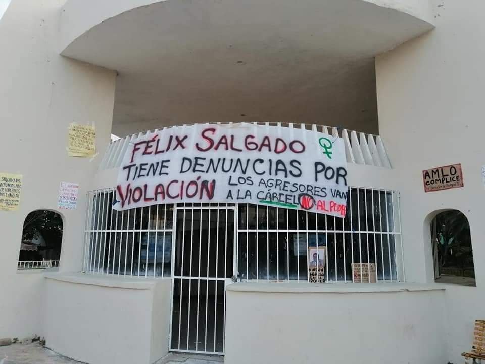 En la lona principal colocada en el kiosko se leía textualmente: “Félix Salgado tiene denuncias por violación, los agresores van a la cárcel”, no a una elección, entre otras consignas.