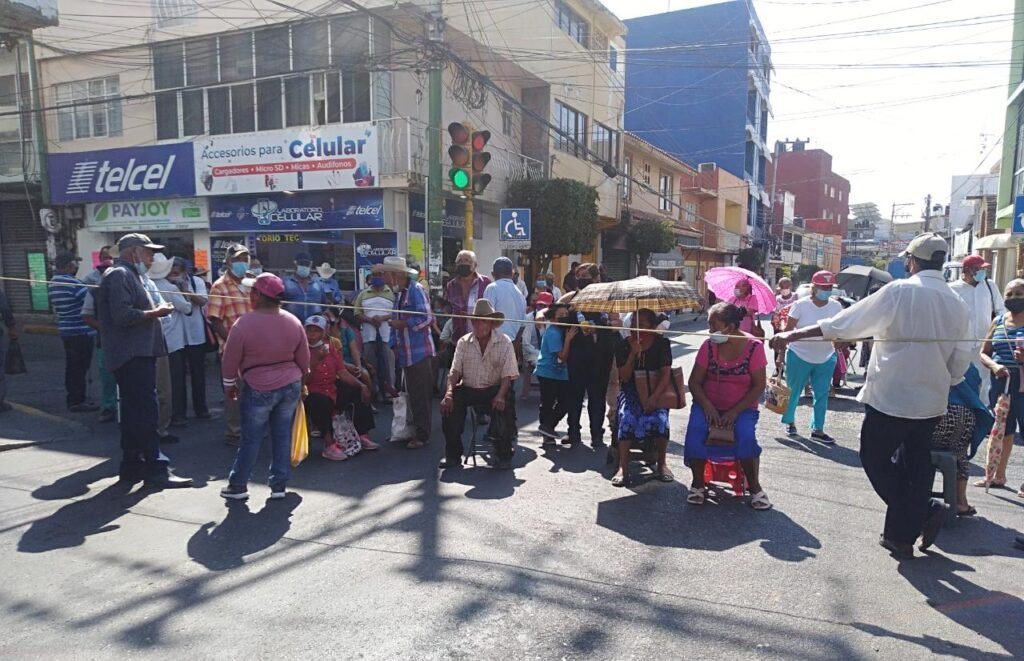 Decenas de adultos mayores, madres solteras y discapacitados se colocaron sobre las avenidas Juan Álvarez e Ignacio Ramírez, en esta capital, y las bloquearon, ocasionando caos vial.