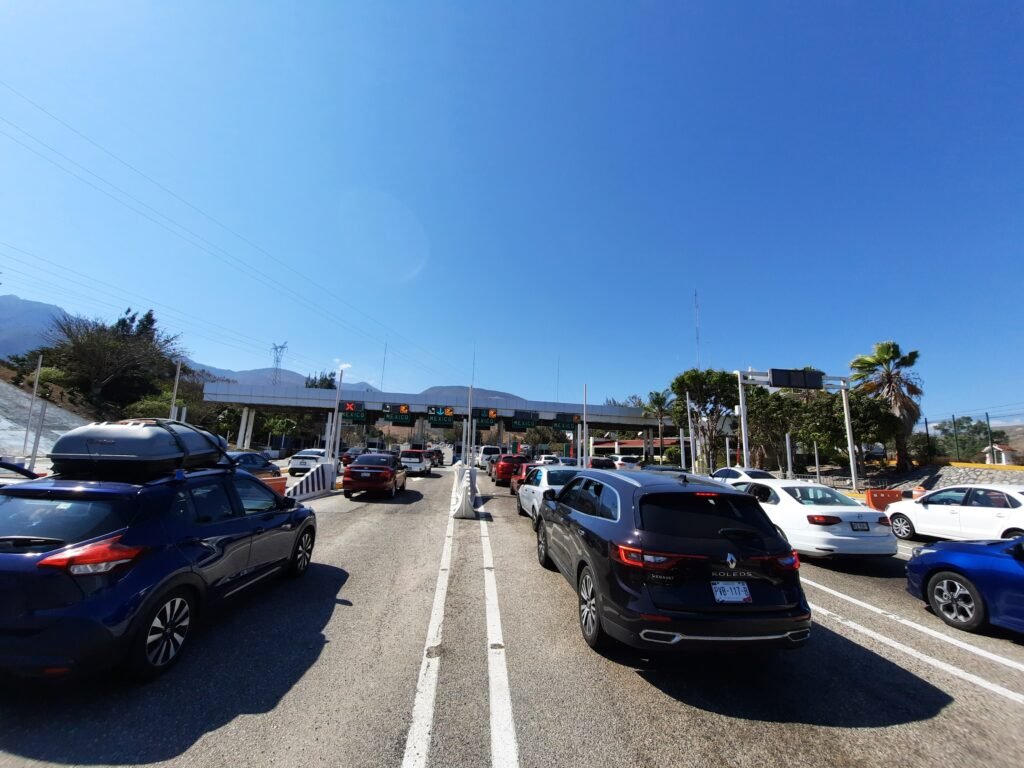 Para llegar a la caseta de peaje ubicada en Palo Blanco desde el puerto de Acapulco, alrededor de las 2 de la tarde, la fila de automóviles para pagar la cuota de peaje era de cuando menos 2 kilómetros y para las 6 de la tarde eran casi 3 kilómetros.