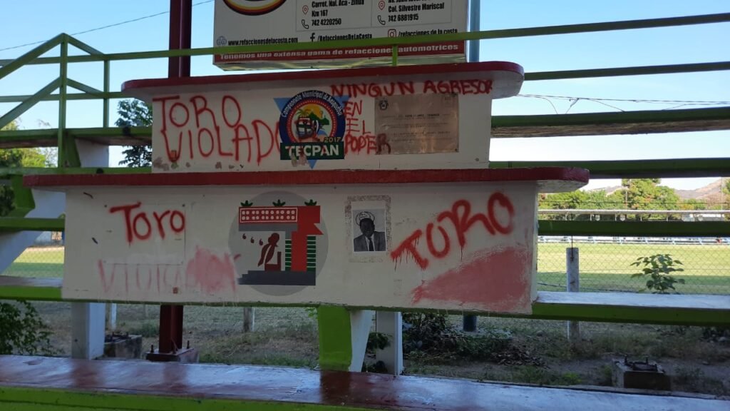 Un grupo de feministas ingresó a la Unidad Deportiva de Tecpan de Galeana, donde realizó pintas previo a la visita de Félix Salgado Macedonio, hasta ayer, candidato de Morena a la gubernatura de Guerrero.