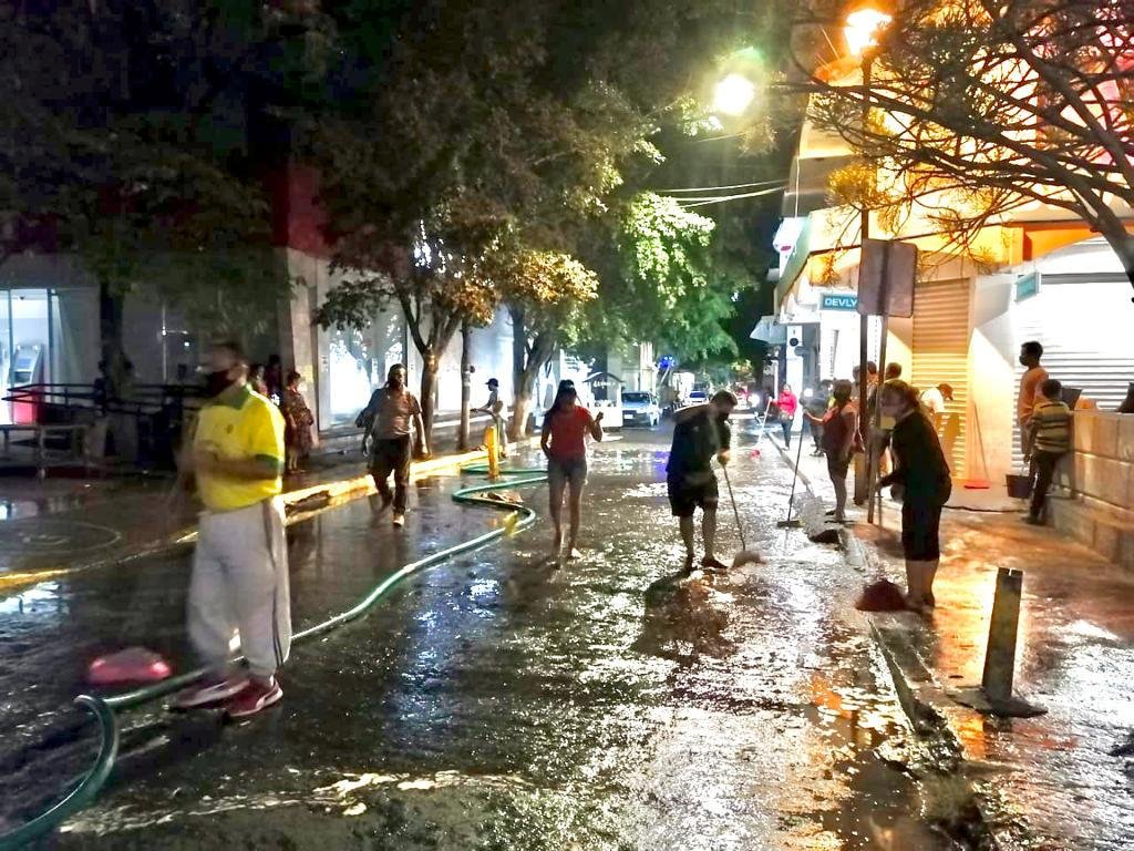 Anoche, la Dirección de Gobernación de Chilpancingo, en coordinación con los comerciantes de la calle Francisco I Madero, frente al Casino del Estudiante, en el Centro de la ciudad, limpiaron y desinfectaron su área comercial para ofrecerle a los consumidores espacios saludable y hacerle frente a la pandemia por COVID-19.