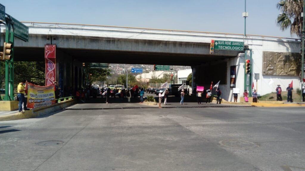 Integrantes de Antorcha Campesina bloquearon las avenidas Ruffo Figueroa y Lázaro Cárdenas, a un costado de la tienda Aurrerá, al sur de la capital, para exigir a la Secretaría General de Gobierno agilice los trámites para regularizar las colonias Nueva Revolución y Candelaria.
