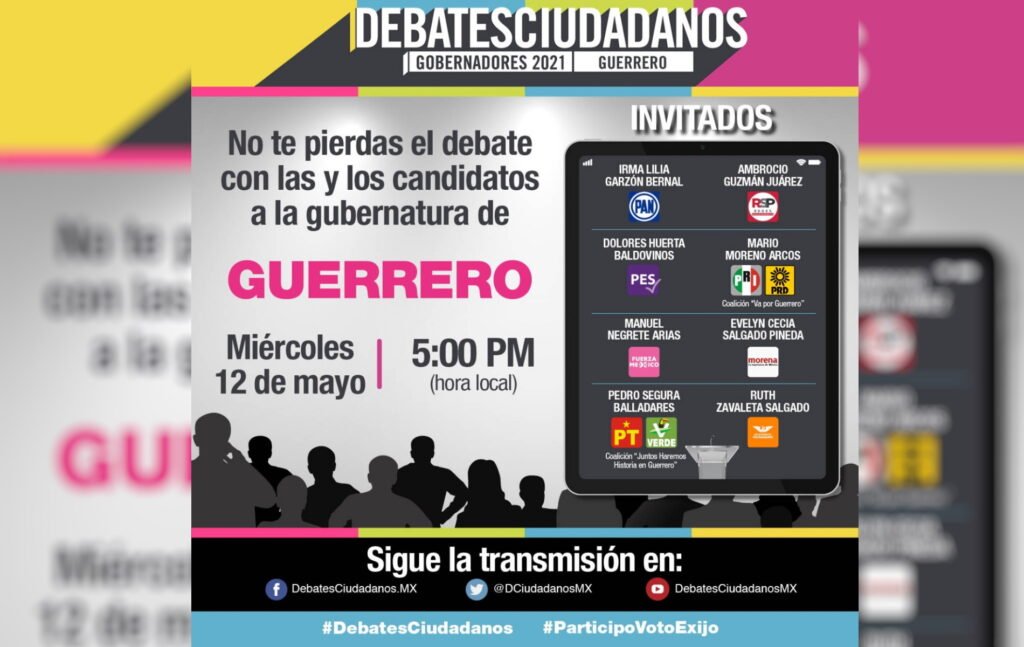 Indicaron que el debate se realizará el próximo 12 de mayo de 2021, a las 5 de la tarde, en el Salón Acapulco del Hotel Holiday Inn, en Chilpancingo, “en la modalidad de Debate Presencial” y se transmitirá a través de las redes sociales de Debates Ciudadanos de Facebook, You Tube y Twitter.
