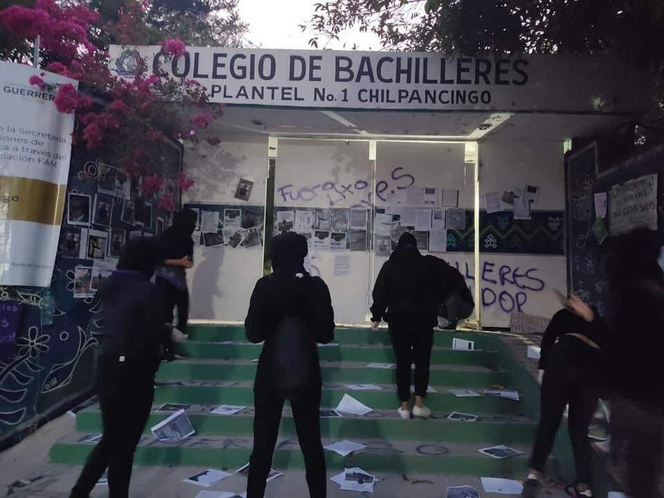 Feministas realizaron este miércoles, pintas y pegaron carteles en las instalaciones del Colegio de Bachilleres plantel 1, en Chilpancingo, en protesta por los presuntos acosos y hostigamientos sexuales que viven alumnas por parte de sus profesores.