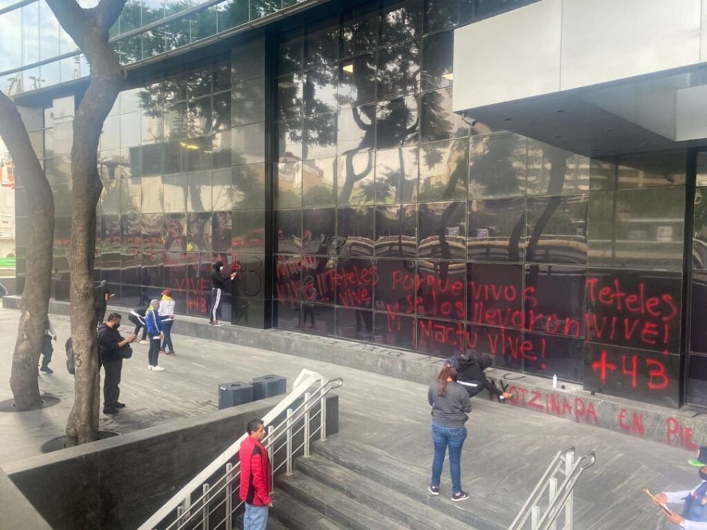 Durante una manifestación en la Ciudad de México, los estudiantes también realizaron pintas con tinta negra y roja en la fachada del edificio, con las inscripciones: “Esta es la 4T??”, “AMLO decía que todo cambiaría. Mentira. Mentira. La misma porquería”, “+43”, “Ayotzinapa vive”, entre otras consignas.