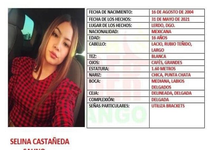 Selina Castañeda de 16 años, desapareció el 31 de mayo en Durango. El 2 de junio hallaron los restos calcinados de una persona en la colonia Los Ángeles en el municipio de Lerdo. Luego de estudios de ADN correspondientes, lograron determinar que estos restos pertenecían a la menor.