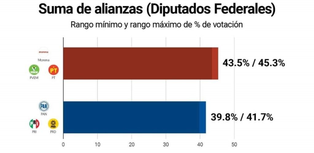 PAN: 106 y 117, PRI: 63 y 75; PRD: 12 y 21; VERDE: 40 y 48; PT: 35 y 41; MC: 20 y 27; MORENA: 190 y 203.