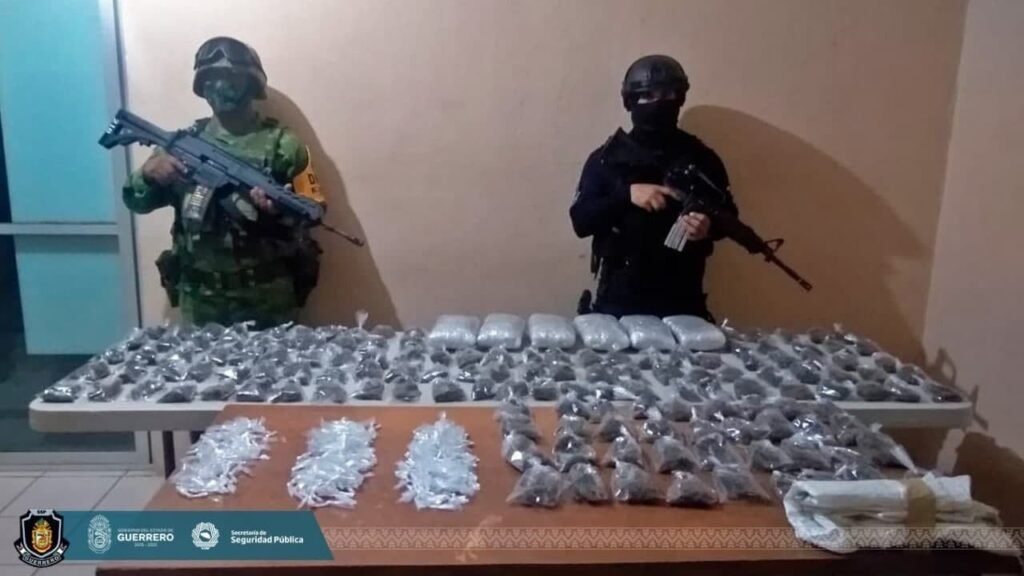 ACAPULCO. — Elementos de la Policía Estatal, en coordinación con personal de la Secretaría de la Defensa Nacional (SEDENA), aseguraron paquetes y bolsas con droga, una motocicleta y una granada.