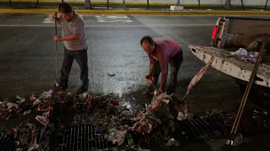 Desde anoche, cuando cayó fuerte lluvia en este puerto, los empleados municipales, encabezados por su coordinador Juan Carlos Manrique García, recorrieron las principales vialidades para retirar desechos que taponearon rejillas del alcantarillado pluvial.