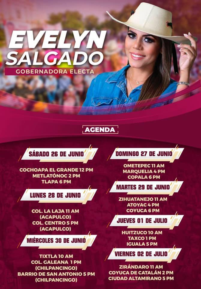 Este sábado, Evelyn Salgado inicia una gira de agradecimiento por las siete regiones de la entidad y empezará en la Montaña alta, con una visita a las cabeceras municipales de Cochoapa el Grande, Metlatónoc y Tlapa.