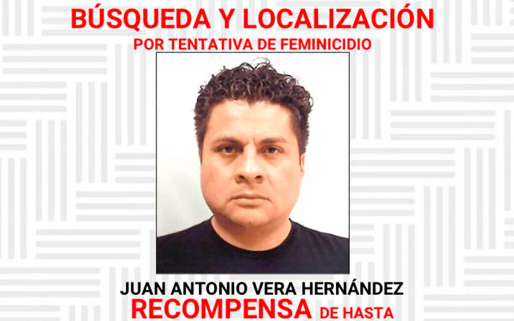 A Juan Antonio Vera Hernández las autoridades de justicia lo buscan por “tentativa de feminicidio” y aseguran que la recompensa es de hasta 1 millón de pesos a quien dé información veraz, útil y eficaz para su captura.