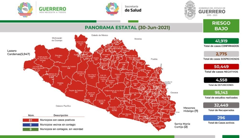 La Secretaría de Salud informó que en las últimas 24 horas se notificaron 64 nuevos contagios y 3 personas fallecidas por la pandemia de Covid-19 en el estado de Guerrero.
