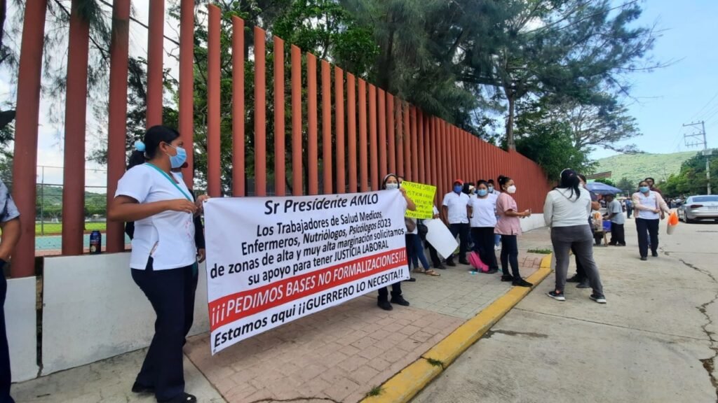 Chilapa, Gro.- Médicos y enfermeras de contrato se manifestaron en Chilapa durante la visita del presidente de la República, Andrés Manuel López Obrador, en demanda de basificaciones y estabilidad laboral.