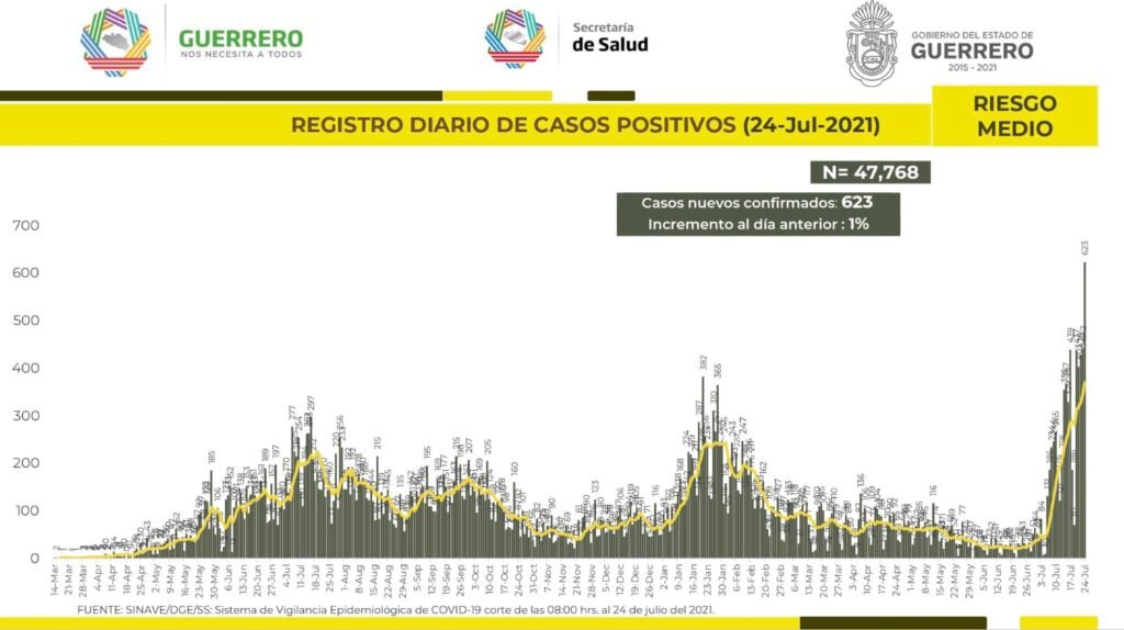 El estado de Guerrero rompió un nuevo récord de contagios diarios de Covid-19, al reportar 623 en las últimas 24 horas, informó la Secretaría de Salud del estado a través de sus redes sociales esta tarde.