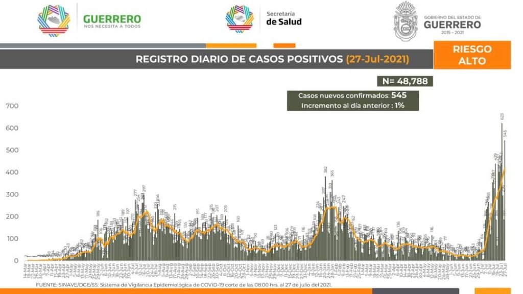 En las últimas 24 horas se infectaron de Covid-19 un total de 545 personas en Guerrero, lo que representa un incremento en la incidencia del 1 por ciento con respecto al día anterior.