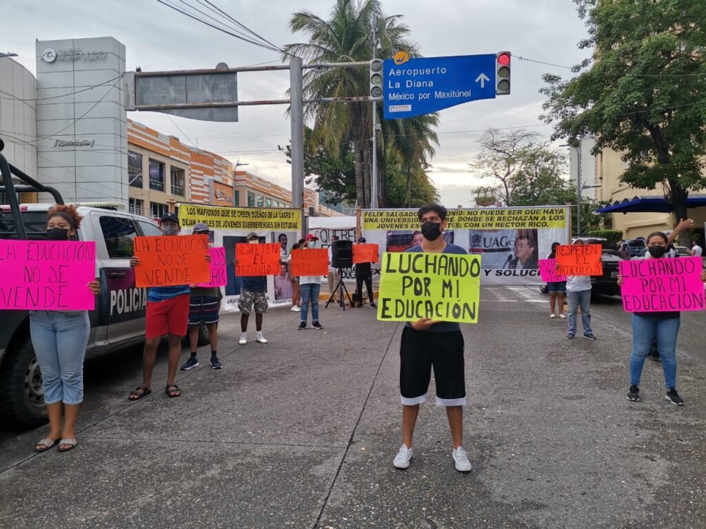 Jóvenes que piden su ingreso a la Universidad Autónoma de Guerrero (Uagro) bloquearon este jueves la Costera Miguel Alemán, a la altura de un centro comercial, para exigir a las autoridades de esa casa de estudios una solución.