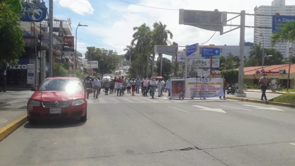 ACAPULCO. —Alrededor de 70 personas marcharon este domingo por la Costera Miguel Alemán, para exigir la presentación con vida de Vicente Suástegui, hermano del vocero del Consejo de Ejidos y Comunidades Opositores a la Parota (Cecop), Marco Antonio Suástegui Muñoz.