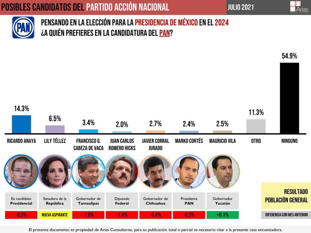 En el PAN, Ricardo Anaya se mantiene encabezando las tendencias, ubicándose con el 14.3%. seguido por la Senadora Lily Téllez, con una preferencia de 6.5%. El presidente del partido blanquiazul, Marko Cortés sigue sin figurar, mientras tanto, entre los simpatizantes del PAN, la imagen de Ricardo Anaya toma fuerza, teniendo una preferencia del 46.6%.