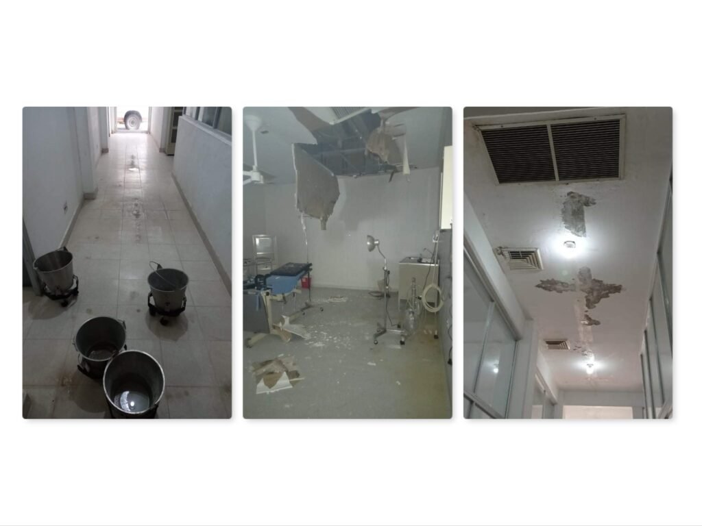 Desde el lunes, los trabajadores iniciaron un paro de labores para denunciar las pésimas condiciones en las que laboran y que se han agravado por las constantes lluvias registradas en los últimos días, que han provocado filtraciones de agua desde el techo y desprendimiento de varios plafones en consultorios médicos y áreas de atención a mujeres en labor de parto.