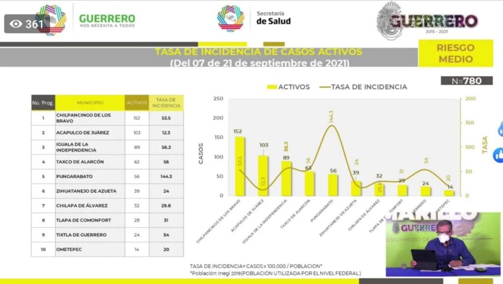 Estos son los municipios donde se concentra la mayor cantidad de casos activos, sin embargo, en la tasa de incidencia por cada cien mil habitantes, los antes mencionados registran entre el 20 y 57 por ciento, siendo solo Pungarabato el que supera el 144 por ciento, seguido por Iguala en un lejano 56.3 por ciento.