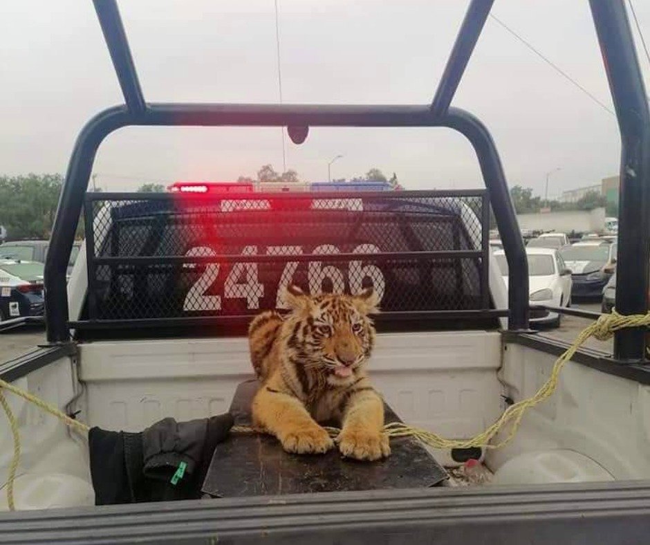 Cuando los agentes de la unidad 24766 llegaron a la zona, encontraron a un cachorro de tigre de unos 5 meses de edad caminando sobre la calle Bosque de Chopo, así que, con temor y todo, lo capturaron, lo subieron a la batea de la patrulla y trasladaron a las instalaciones del Ministerio Público Federal, en el municipio de Tlalnepantla.
