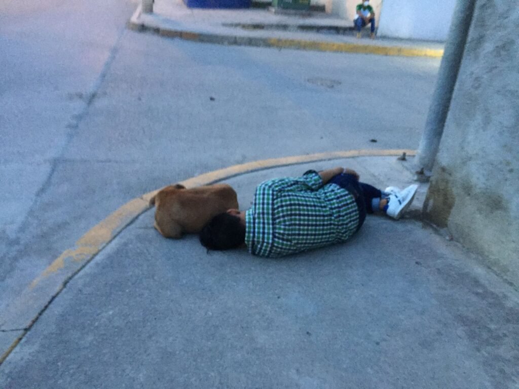 Elementos de la Policía Municipal y Estatal se trasladaron a la zona, en donde localizaron a un hombre dormido sobre la acera, a lado de un perro, el cual al parecer, se acostó a su lado para obtener algo de calor.