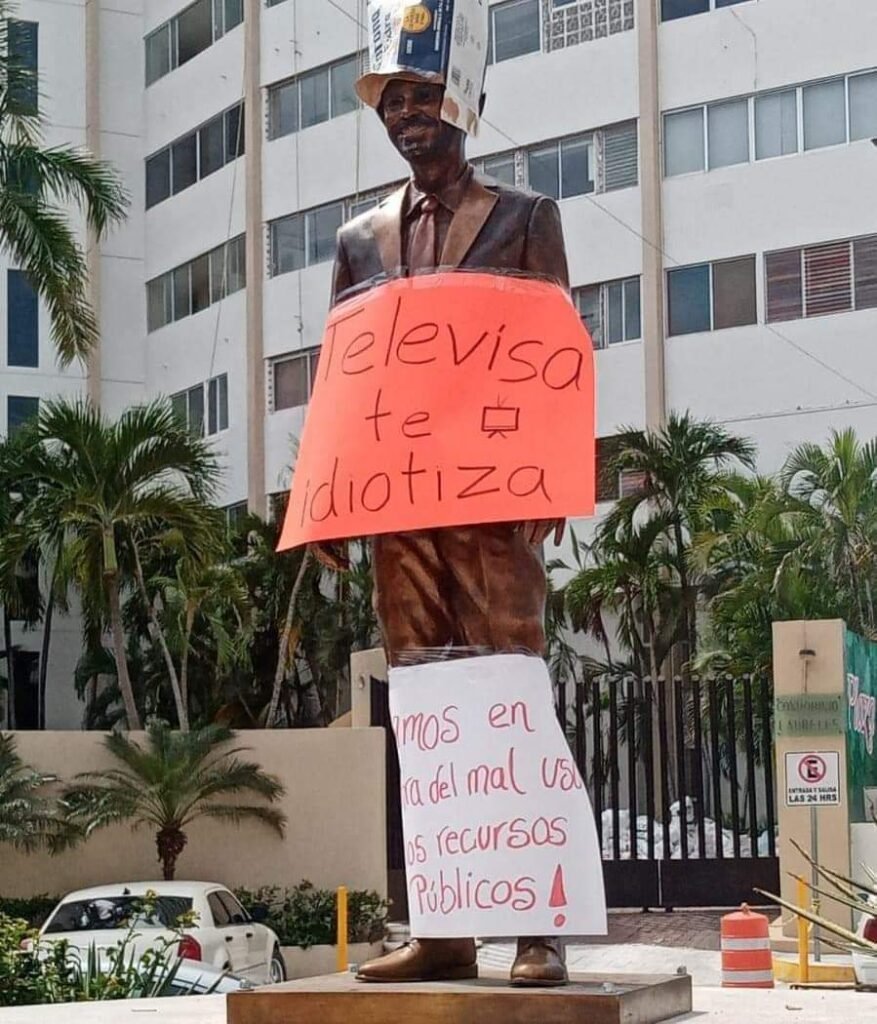 Los inconformes colocaron cartulinas en la estatua del actor y comediante para manifestar su rechazo a la decisión del gobierno estatal anterior de invertir recursos en un monumento, en plena crisis por la pandemia de Covid-19.